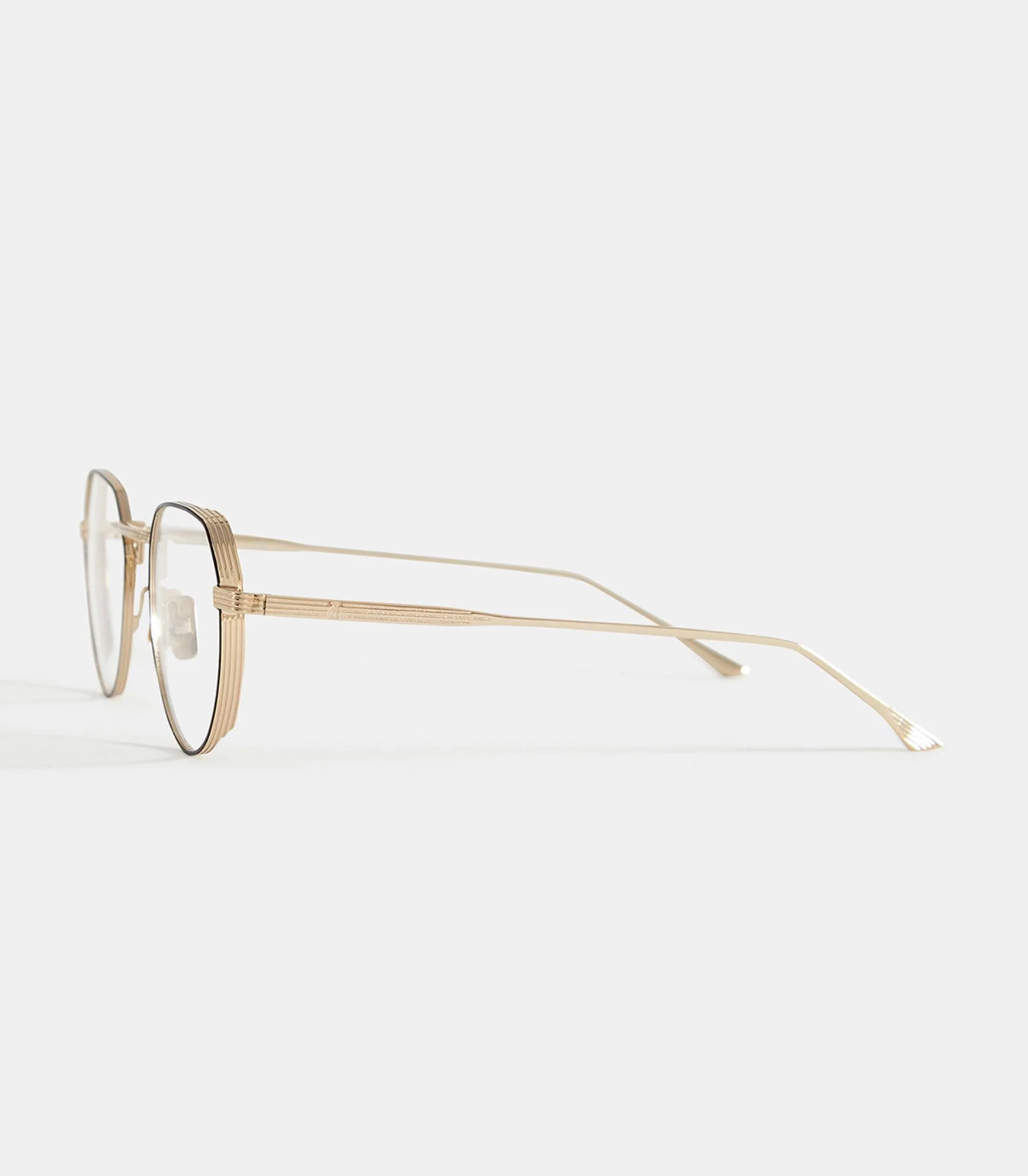 Monture métal pilote à double pont avec une sur épaisseur, striées sur les bords extérieurs. Branches métalliques avec détails striés. Plaquettes titanium.