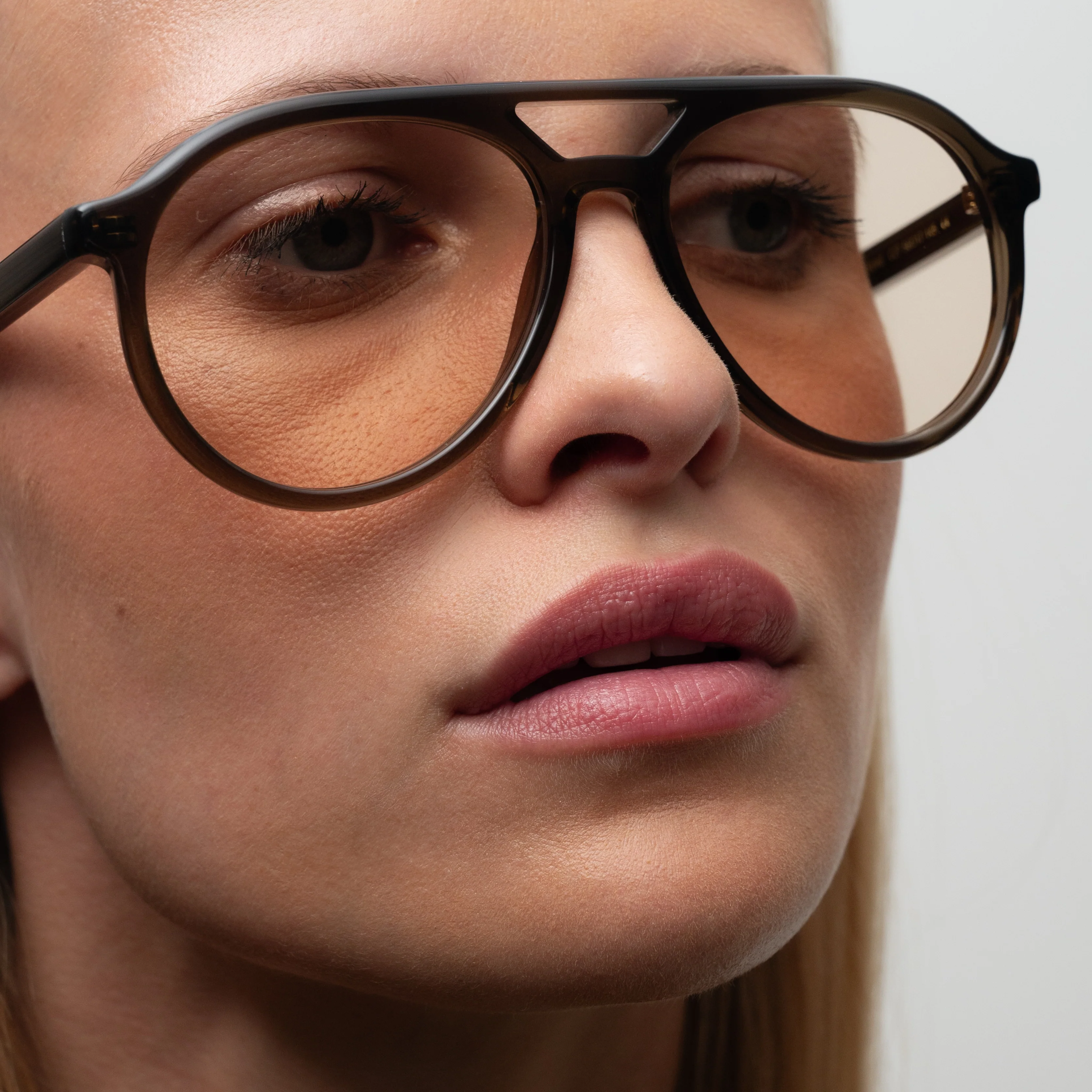 Monture légÚre en acétate premium inspirée des années 80 de forme pilote arrondie équilibrée par des contours adoucis. Forme vintage, double pont.