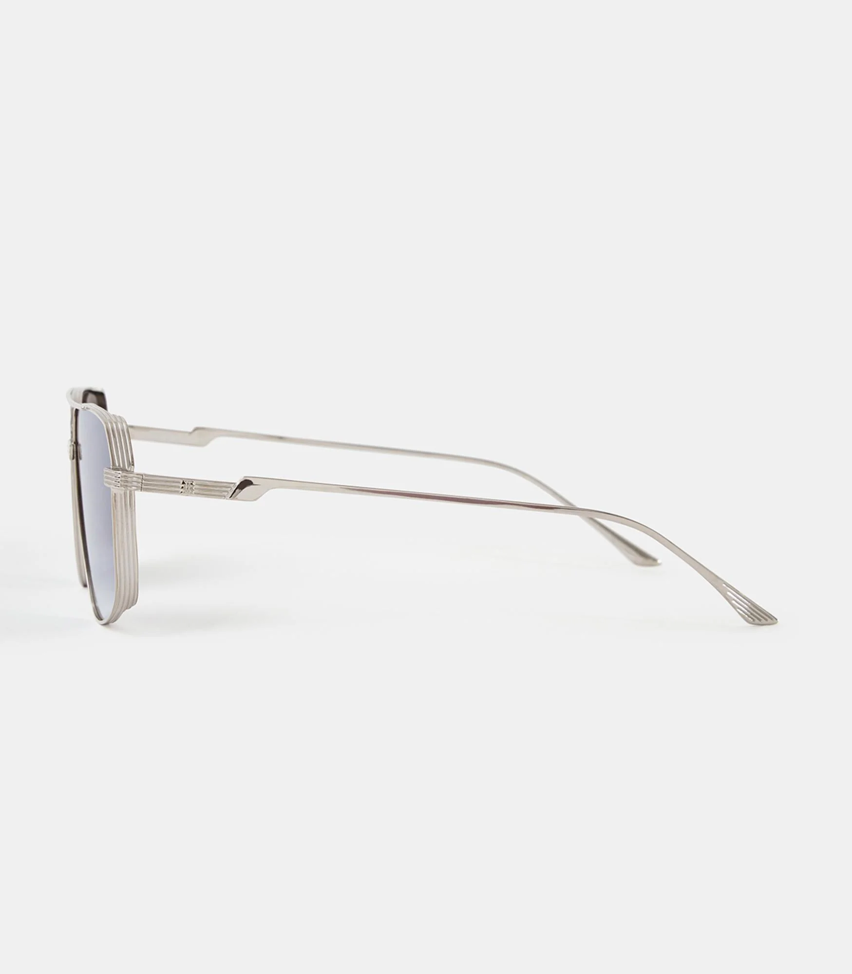 Monture futuriste en métal de forme pilote, en acier inoxydable à double pont. Branches fines et striées.