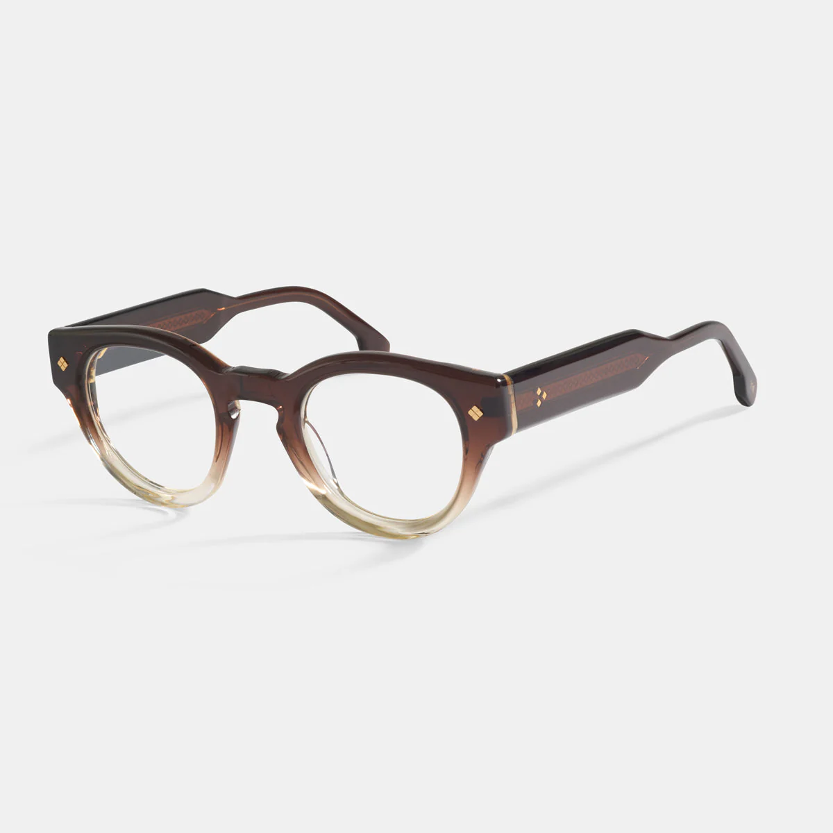 Monture en acétate Mazzucchelli de forme ronde. Rivets carrés apparents sur les bords et sur les branches, ainsi que détails de pictogrammes gravés.