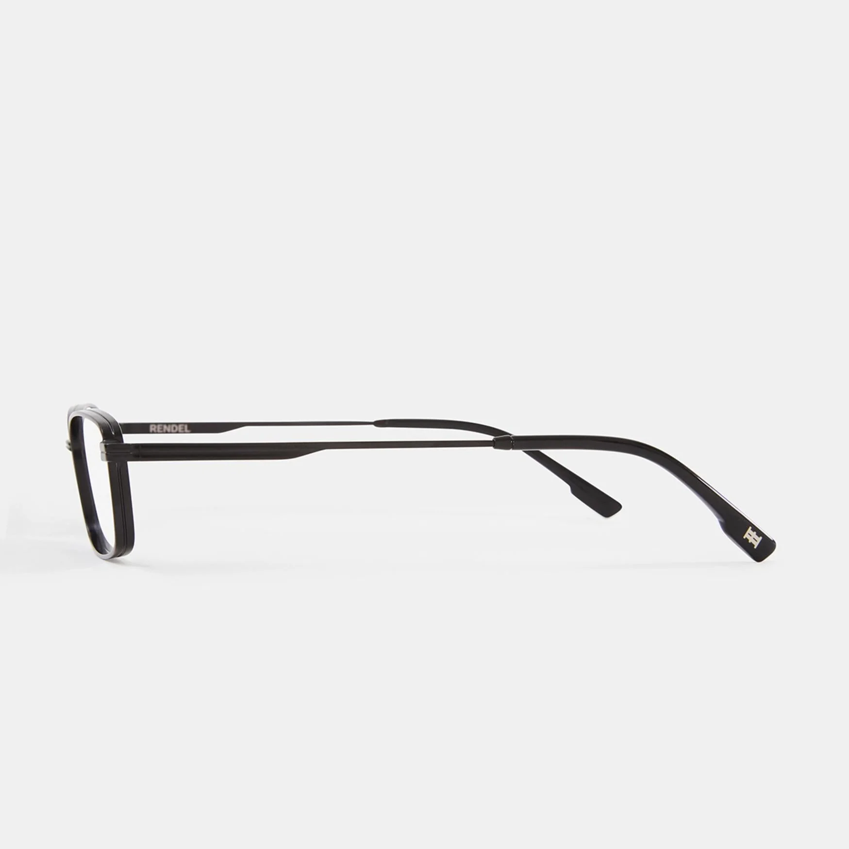 Monture métallique rectangulaire. Fines branches avec manchons en acétate, et déport sur la face avant du verre.